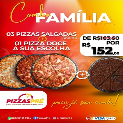 3 pizzas salgadas (30cm) + 1 pizza doce (30cm)